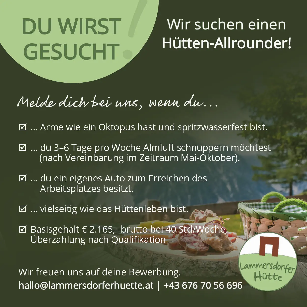 Hier findet ihr unsere Jobangebote für den kommenden Almsommer. Gerne könnt ihr euch aber schon für die nächste Sommersaison bewerben oder uns eine Initiativbewerbung zukommen lassen. Die Details, wie Arbeitszeiten, Verpflegung etc. besprechen wir bei einen persönlichen Gespräch.
